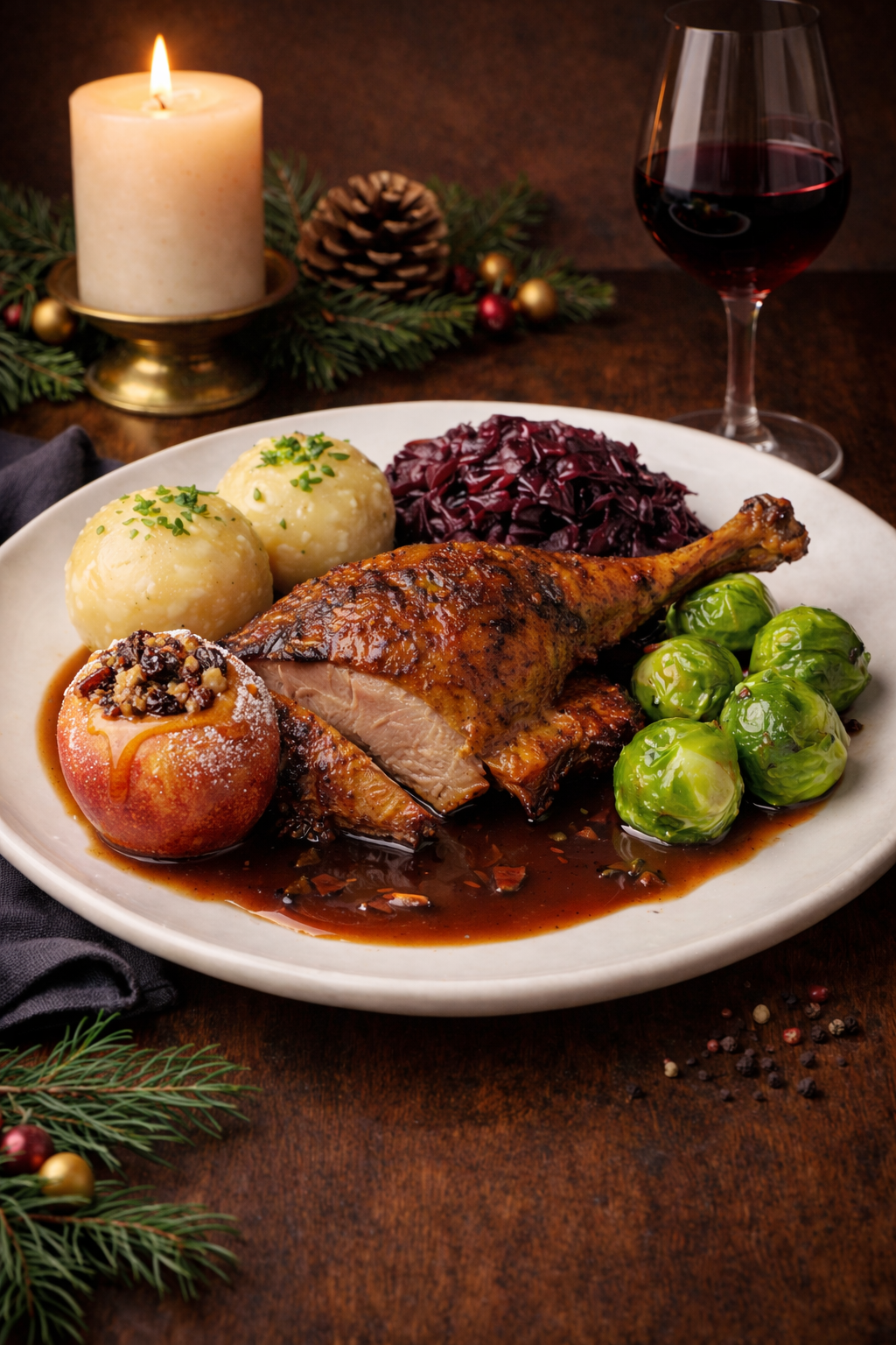 - mit Preiselbeersauce, gefülltem Bratapfel, Rotkohl, Rosenkohl und Kartoffelklößen