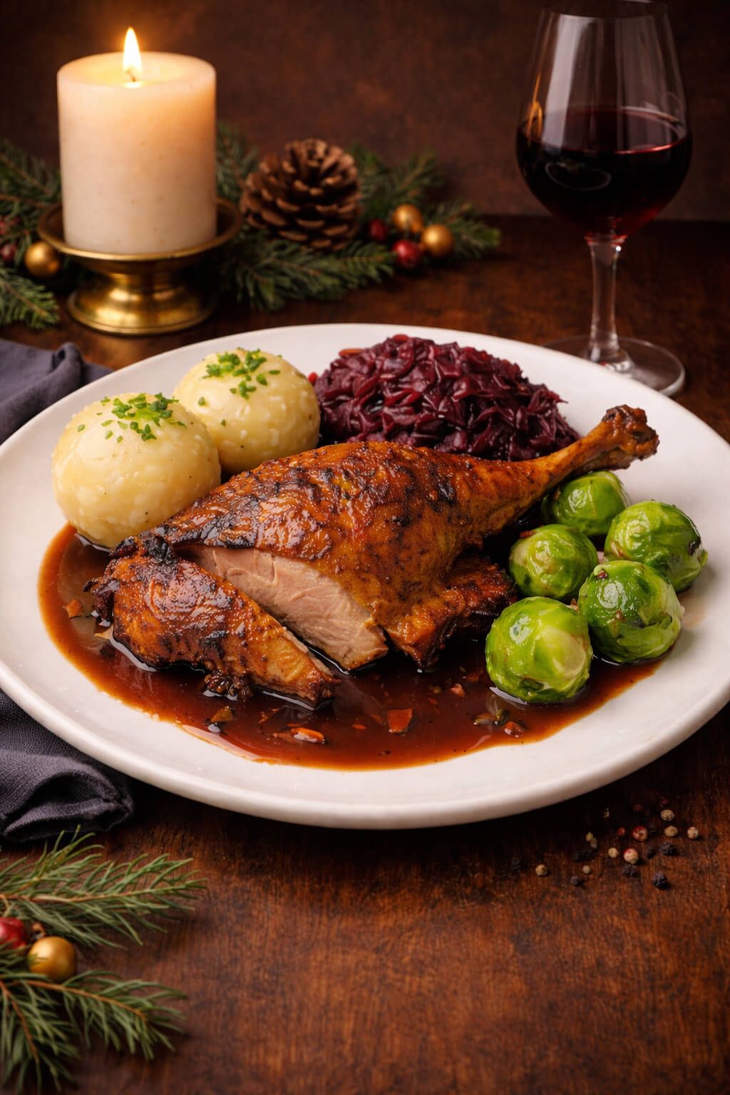 Knusprig braune, gefüllte Weihnachtsgans mit Preiselbeersauce, gefülltem Bratapfel, Rotkohl, Rosenkohl und Kartoffelklößen a1, i, h1, g, 5
